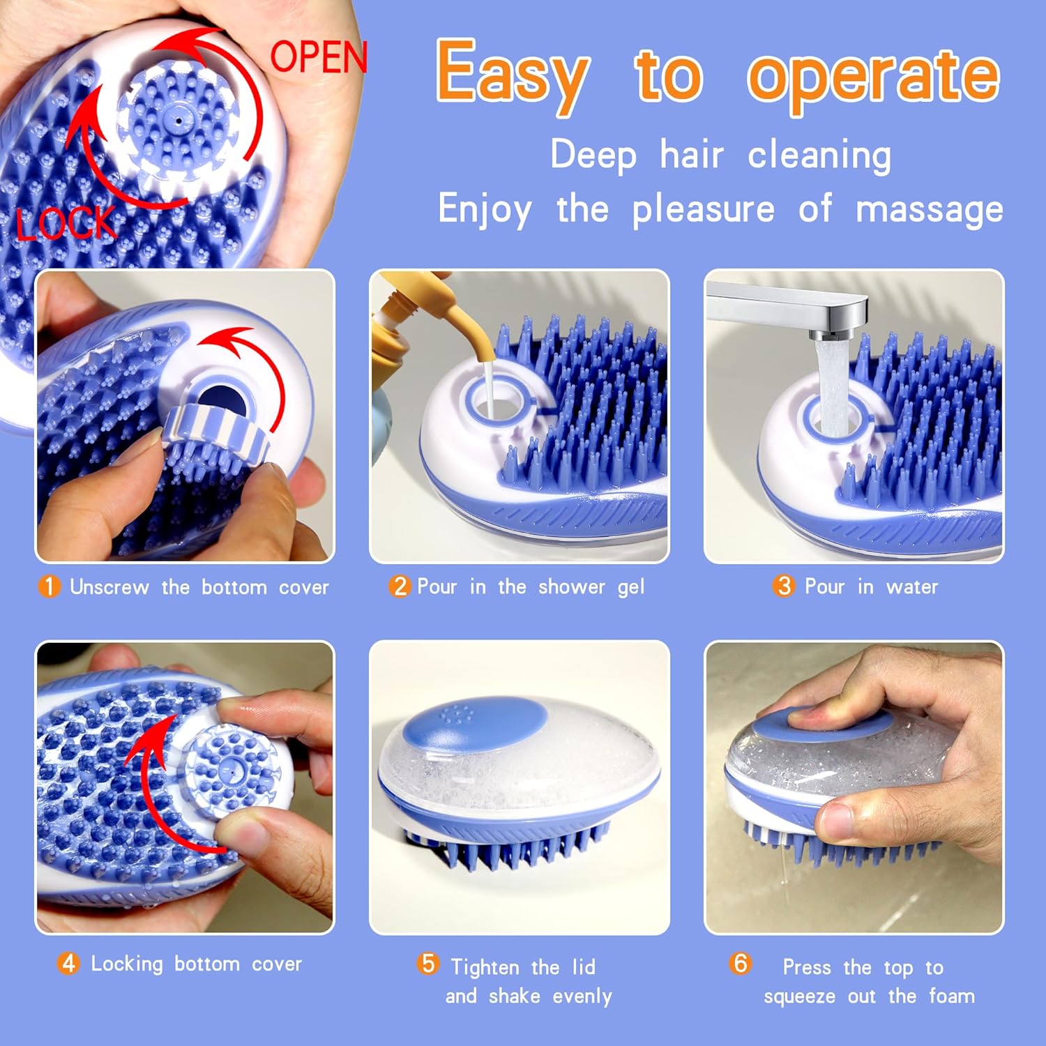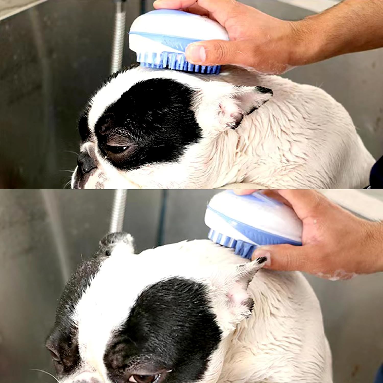 - [Convenient to Use] At the overhead, you can open the small cover and pour shampoo and water. in use, you can pushes the silicone button to produce foam. will gently remove loose hair, dust and dirty. Dog Hair Brush with numerous soft nubs will no-scratching massage without scratching pet skin and dead while bathing.
