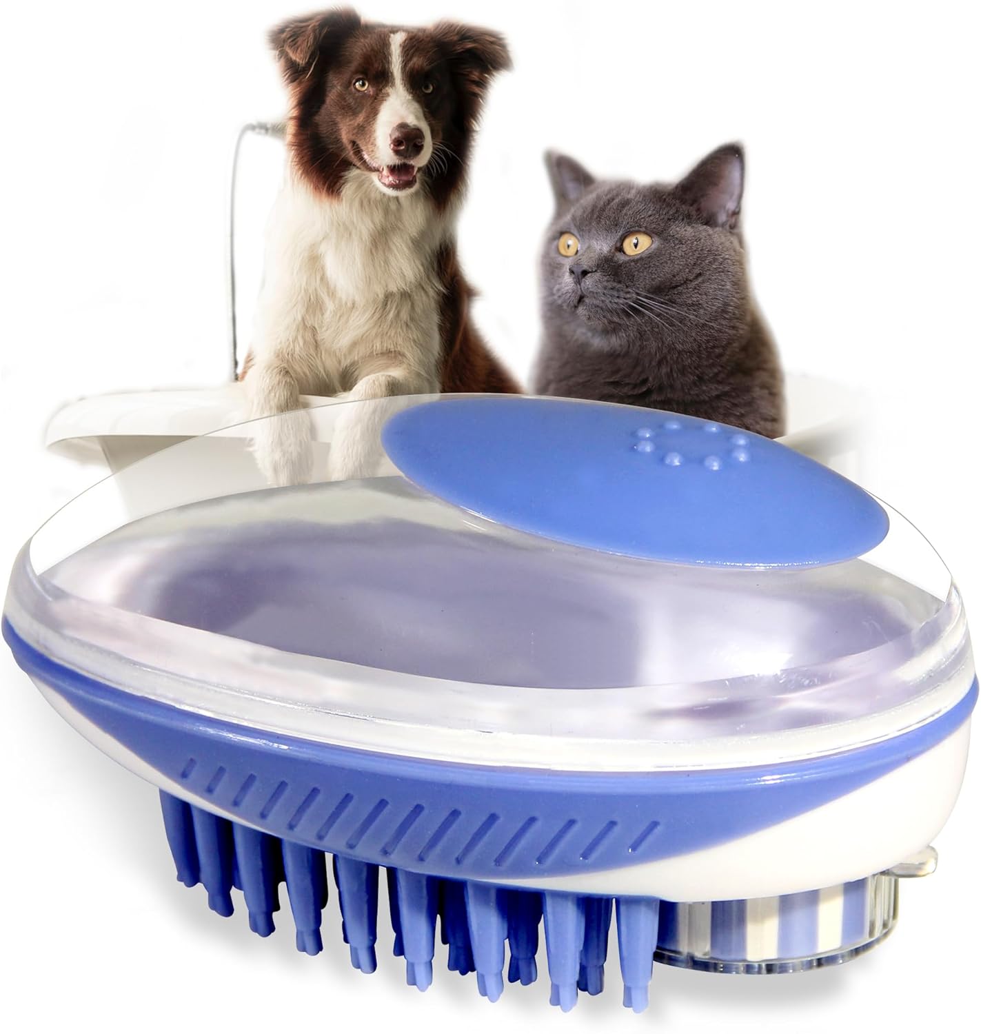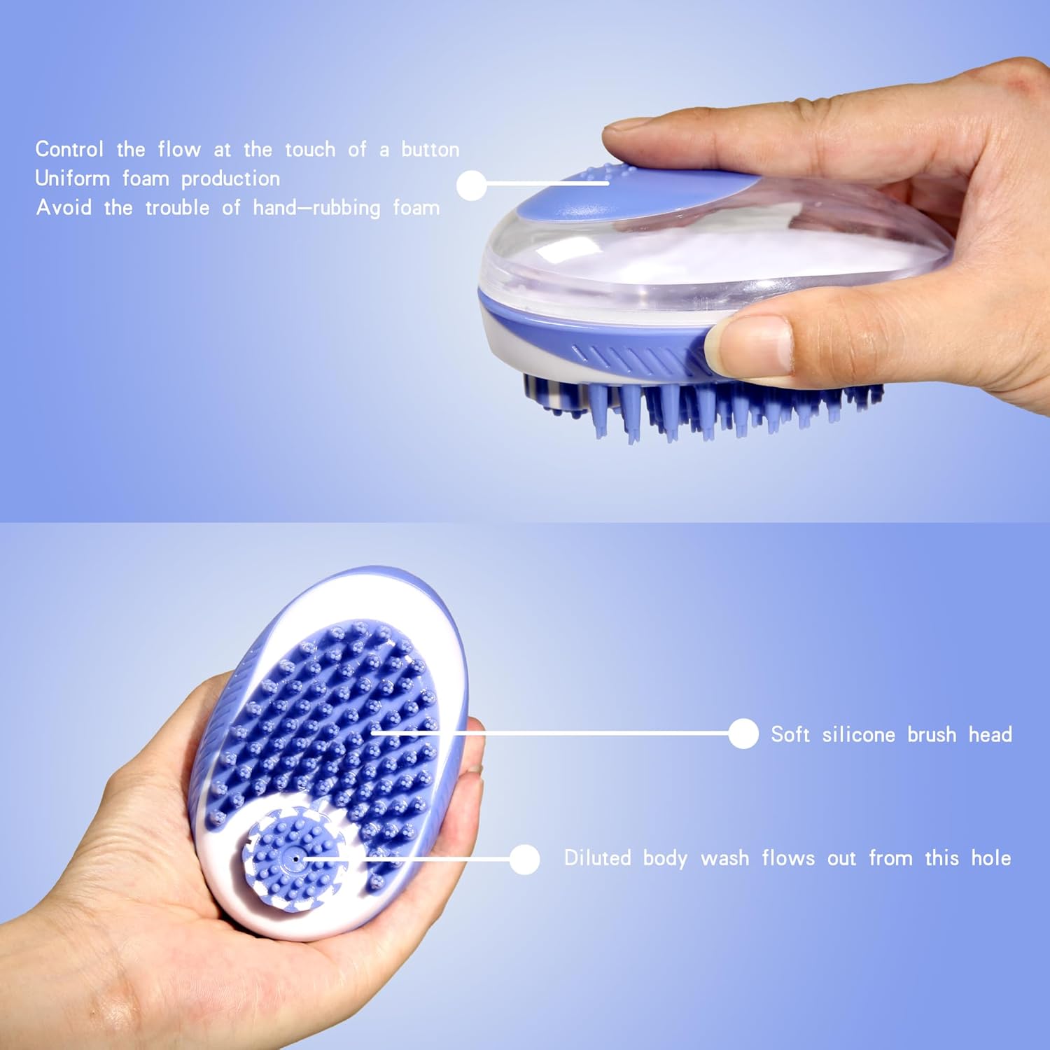 - [ Multi-functional Pet Bathing & Massage Brush] foam reservoir can help you save a lot of times squeezing and diluting shower gel. Dilute the pet shampoo beforehand, then pushes the to dispense blisters to your pet‘s coat while taking a shower. This is not only can save shower gel, but also easier to create foam.